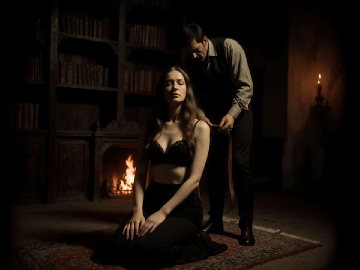 The study was a sanctuary of shadows, the kind of room where time seemed to slow, where the weight of the world could be set down—if only for a little while. Heavy oak bookshelves lined the walls, their spines worn from years of use, the scent of aged paper and polished wood lingering in the air like a quiet promise. A single lamp cast a warm, amber glow across the Persian rug beneath her knees, its intricate patterns muted in the dim light. The rest of the room was swallowed by darkness, save for the faint embers of the dying fire in the hearth, its crackling the only sound breaking the silence.